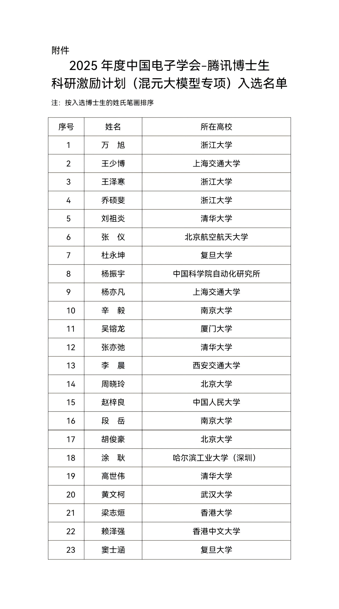 为进一步完善学会人才发现和培养体系,支持大模型相关技术领域在读博士生学业发展和科研实践,中国电子学会联合腾讯公司共同发起了“中国电子学会-腾讯博士生科研激励计划(混元大模型专项)”。入选学生将获得为期一年的10万元/人的科研资助,以及科研平台等其他支持。